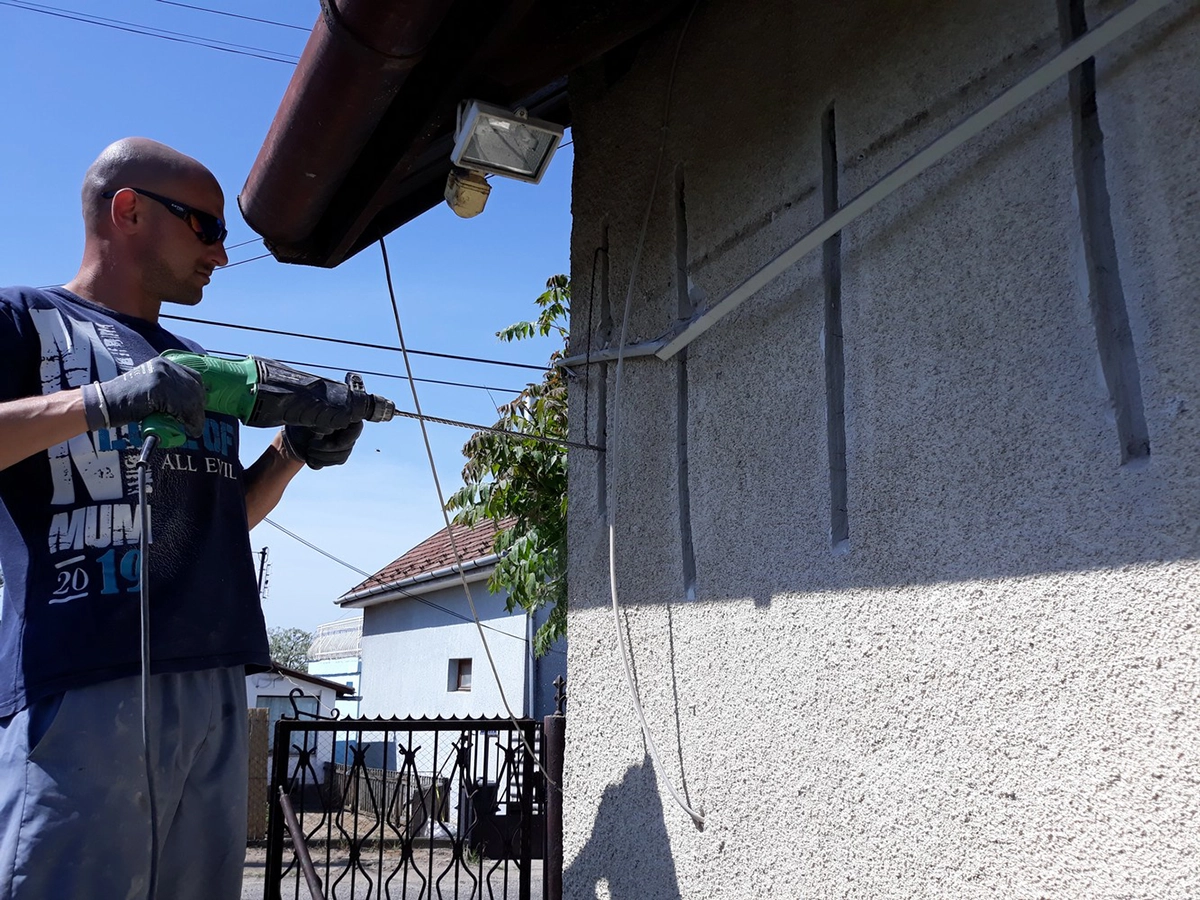 2. Előkészítés: a falba vékony hornyokat vagy furatokat készítünk, amelyekbe a spirálhuzalok kerülnek.